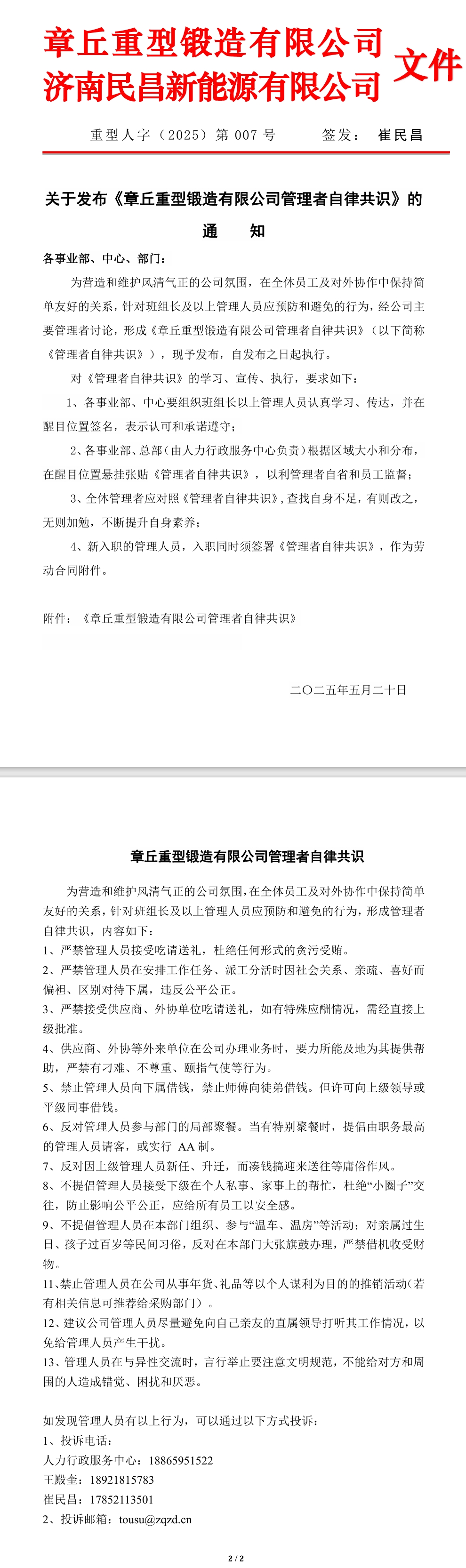 关于发布《章丘重型锻造有限公司管理者自律共识》的通知