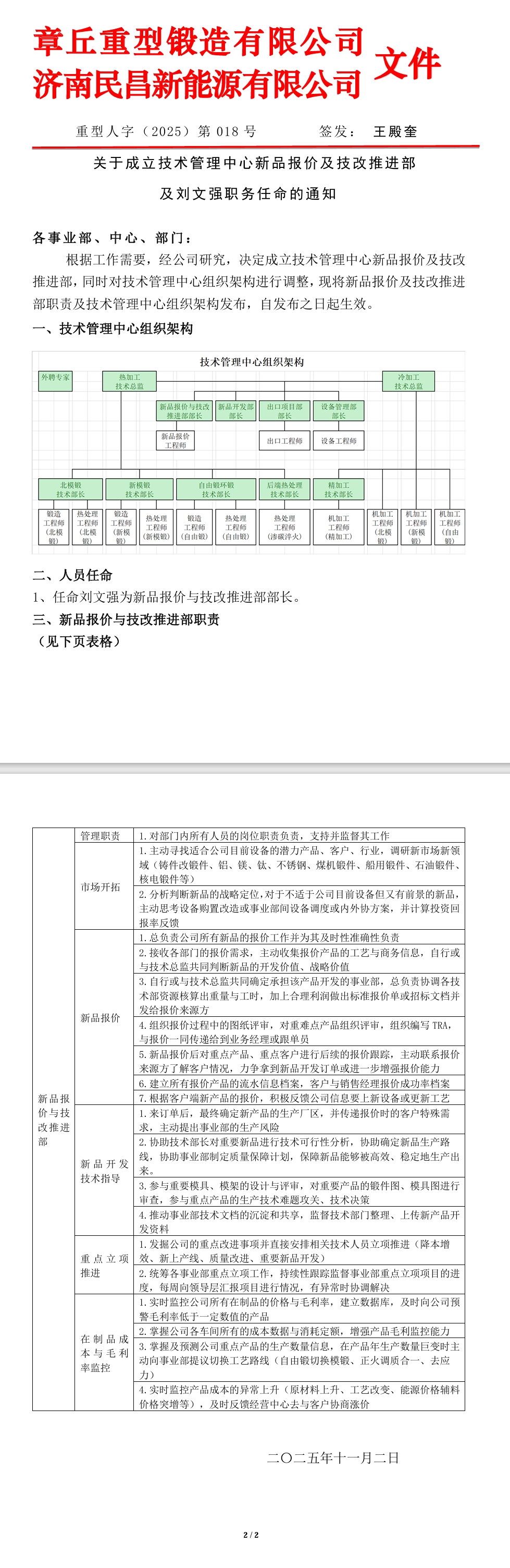 关于成立技术管理中心新品报价及技改推进部 及刘文强职务任命的通知