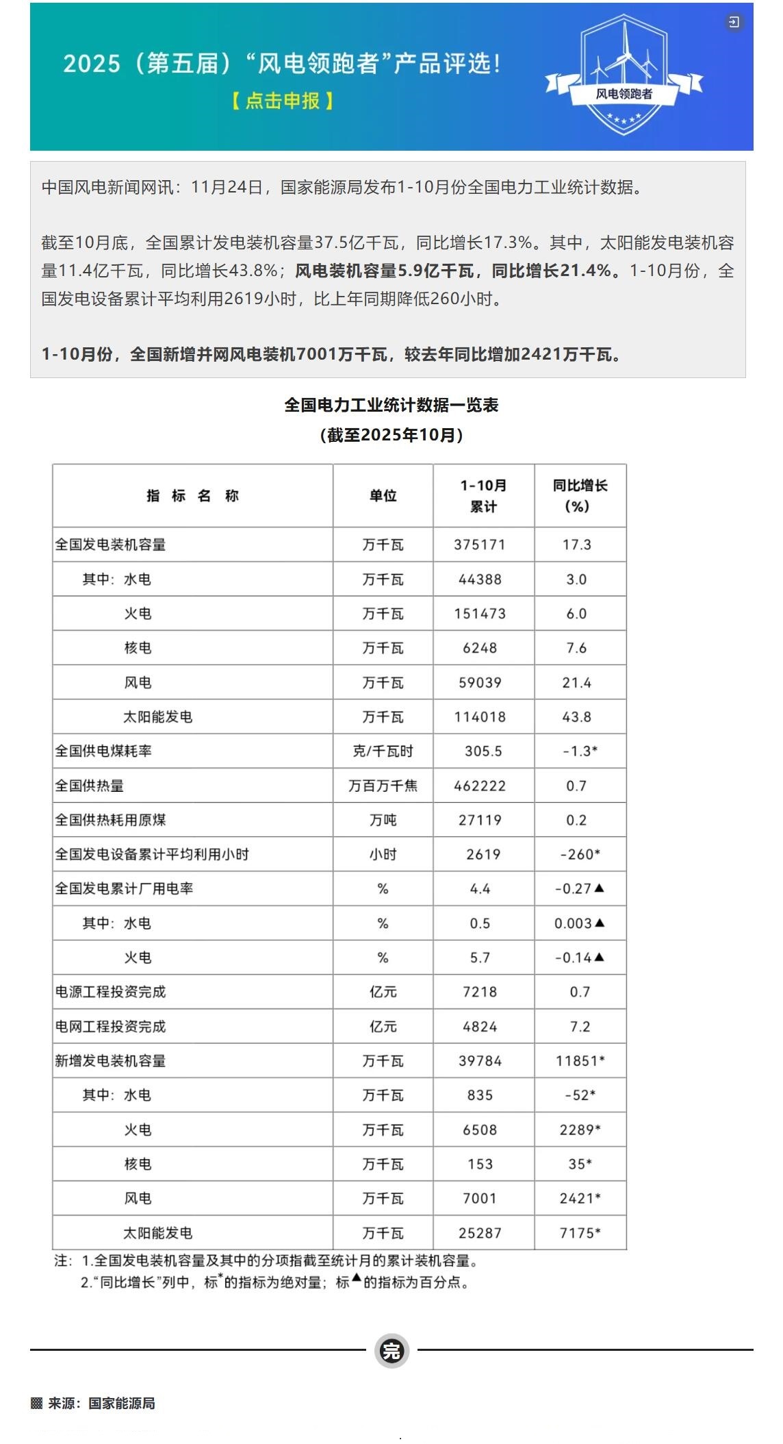 国家能源局:1-10月份,全国新增并网风电装机7001万千瓦